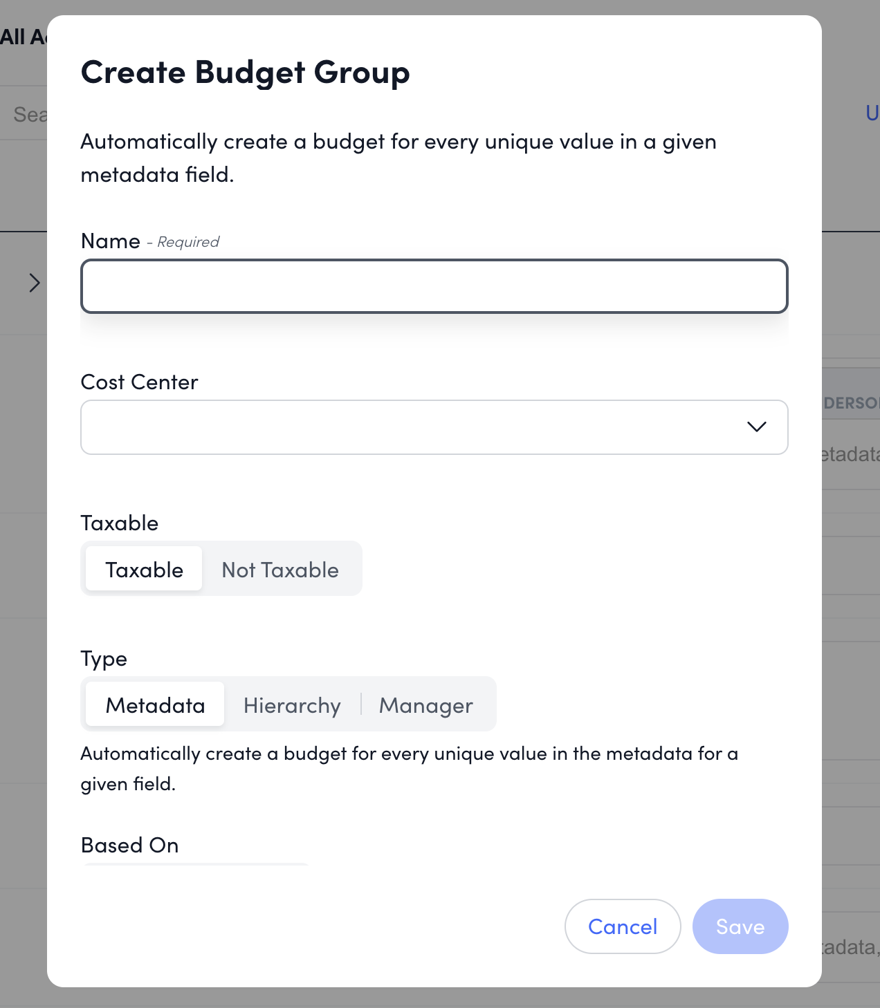The Metadata budget group type automatically creates budgets based on the metadata in your user file uploads. When you choose this type, the system generates a budget for each unique value in the metadata field you select.