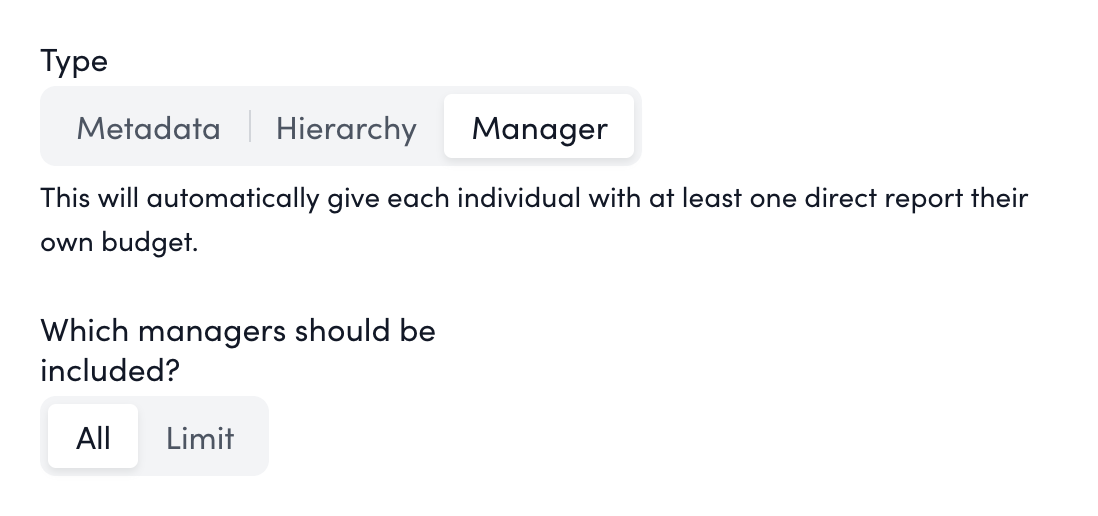 The Manager budget type automatically assigns a budget to each individual who has at least one direct report, as determined by the 'Supervisor ID' in the user file. This simplifies the process by eliminating the need to manually create budgets for every manager in your organization.