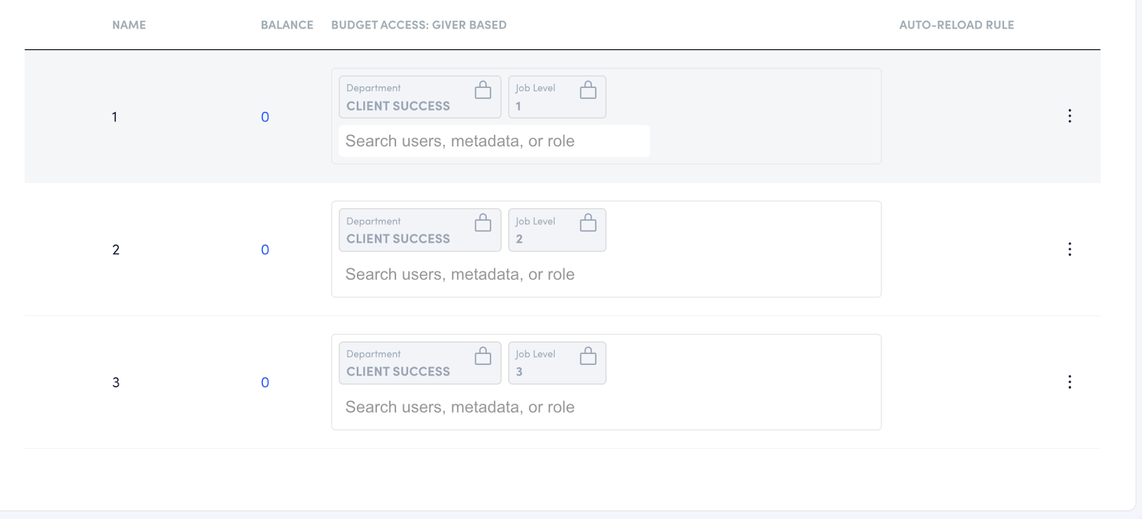 Click on the ellipsis icon to the right of any parent budget in a budget group to edit the budget group name, taxable information, or add auto-reload rules. Additionally, you’re able to archive the group, search the list of users that have budget access in the budget group, or add child budgets.