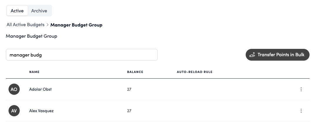- When this toggle is on, archived Manager budgets move to the Archived tab, keep their remaining balance, and can still be used as a source when transferring points to other budgets. Admins and Budget Owners with access to the archived Manager budget can transfer points from that archived budget to other budgets as needed.