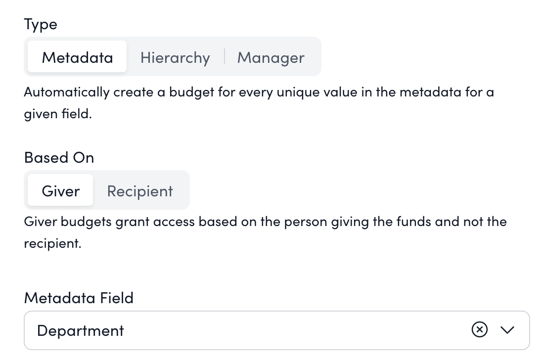 The Based On toggle determines how budget access is granted to users. You can choose either Recipient or Giver.